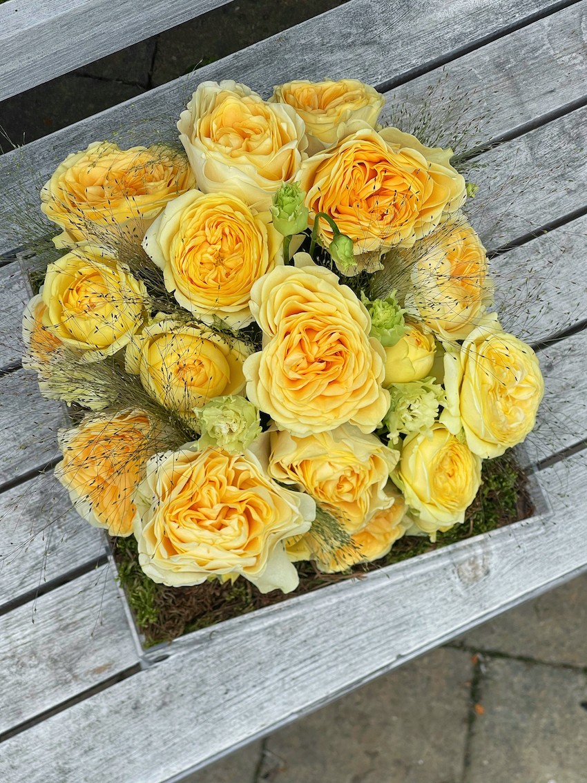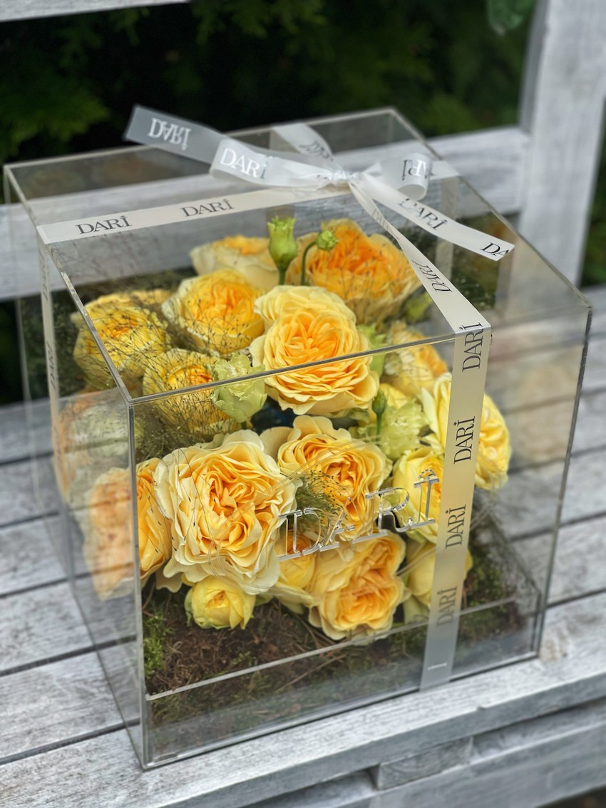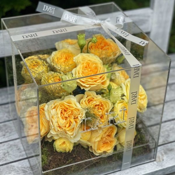 Чтобы композиция радовала вас дольше, держите её вдали от прямых солнечных лучей и отопительных приборов. Не требует вазы, достаточно регулярно увлажнять флористическую губку.