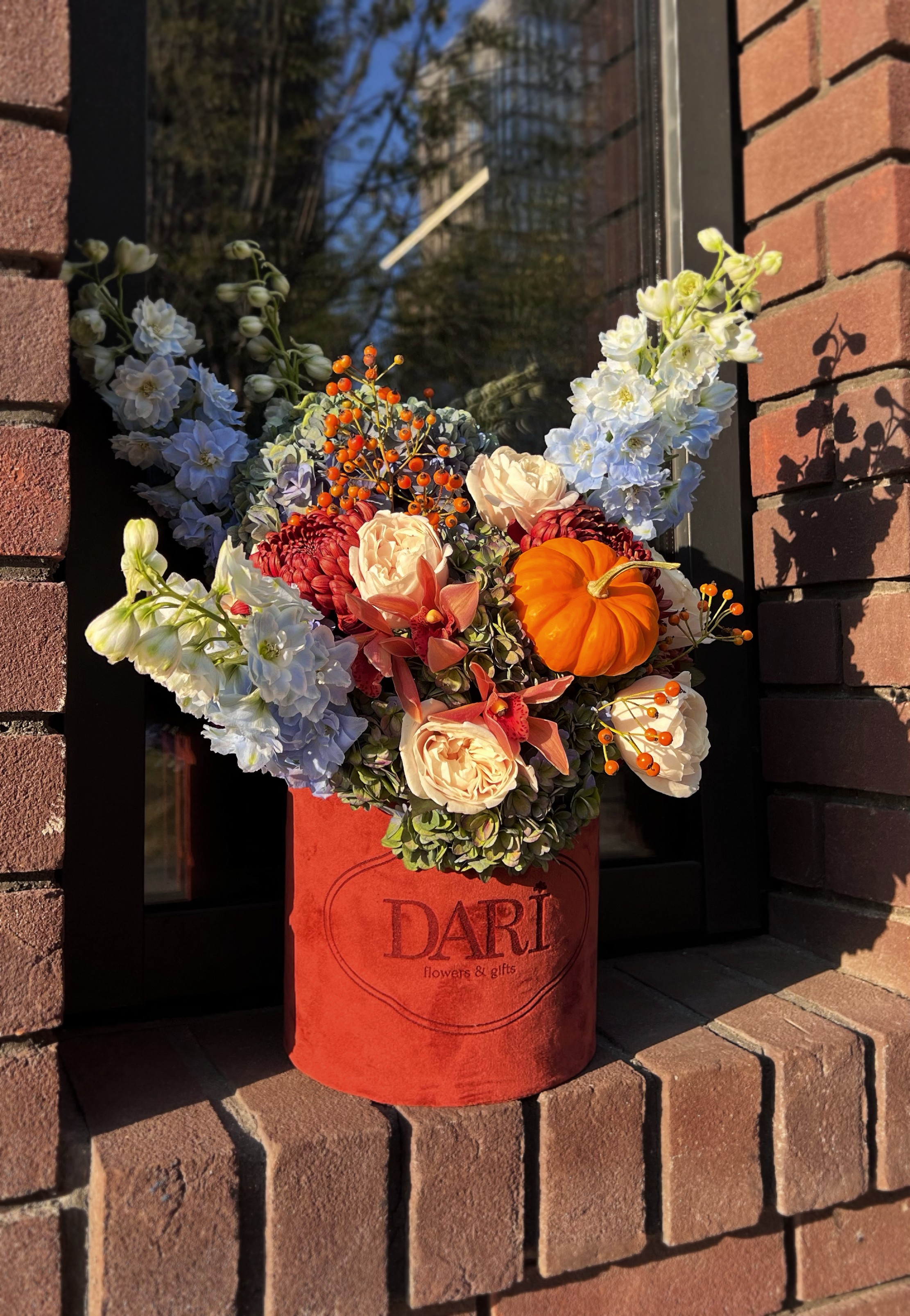 Чтобы композиция радовала вас дольше, держите её вдали от прямых солнечных лучей и отопительных приборов. Не требует вазы, достаточно регулярно увлажнять флористическую губку.